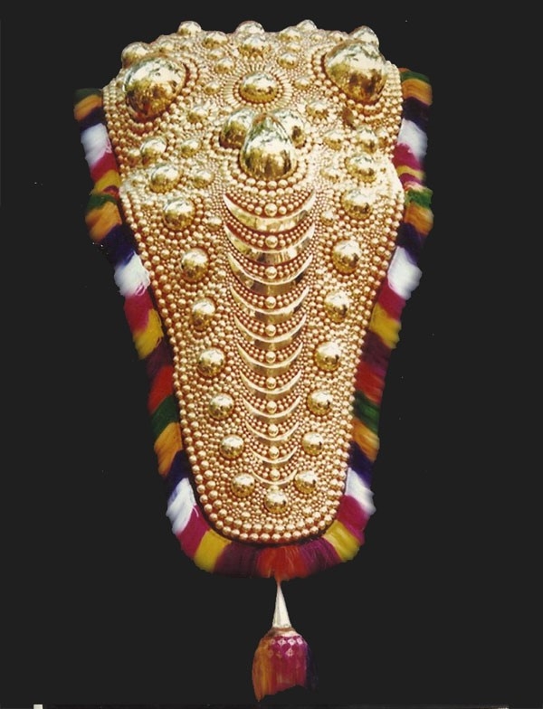 Nettipattam is an ornament used in Kerala and Tamil Nadu to decorate temple Elephants(aka:Caparison). Elephants wear it on its forehead. Nettipattam is made with Gold and Copper. It is an integral part of Kerala culture. Nettipattam and Muthukkuda are a contribution of Buddhism.[1] There are different types of Nettipattam like Chooralpoli, Nagapadam, Vendod, etc. Although it is commonly known as Nettipattam, it is called Thalaikkettu in temples