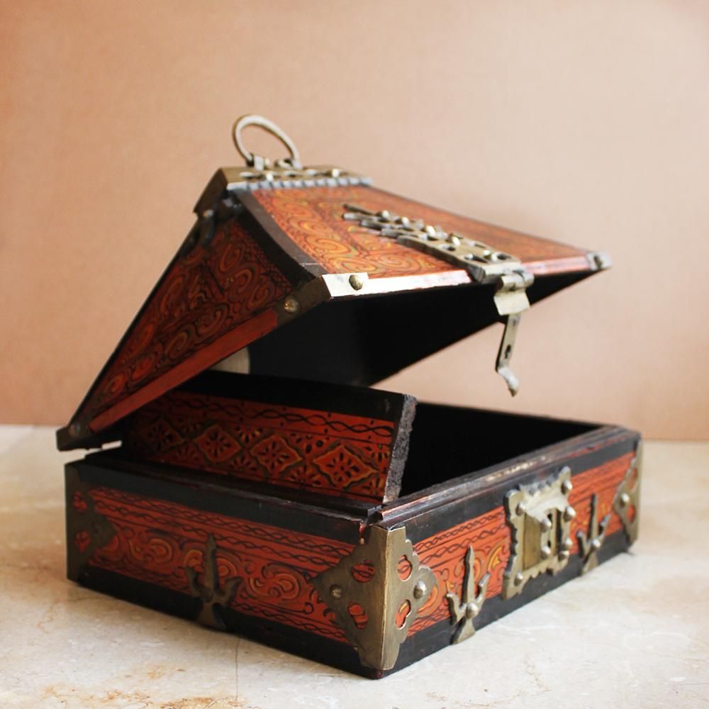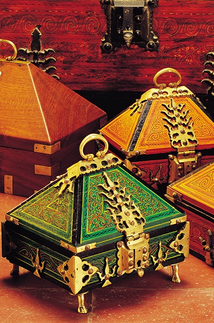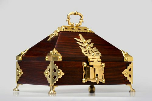 A work of art in itself, it is the result of the skillful labour of many. Each stage of this production demands absolute dedication and dexterity. Many works are performed by hand: the hinges and nails are crafted by hand. The boxes are fashioned out of rosewood and other country woods. Once the wood works are over the decorative polished brass elements are affixed onto it. The pyramidal lid requires special mention and it embellishes the box with a grandiose impression. The ornamental work on the exterior of Nettur Petti and its intricate patterns are inspired by the temple architecture and traditional art forms of Kerala.